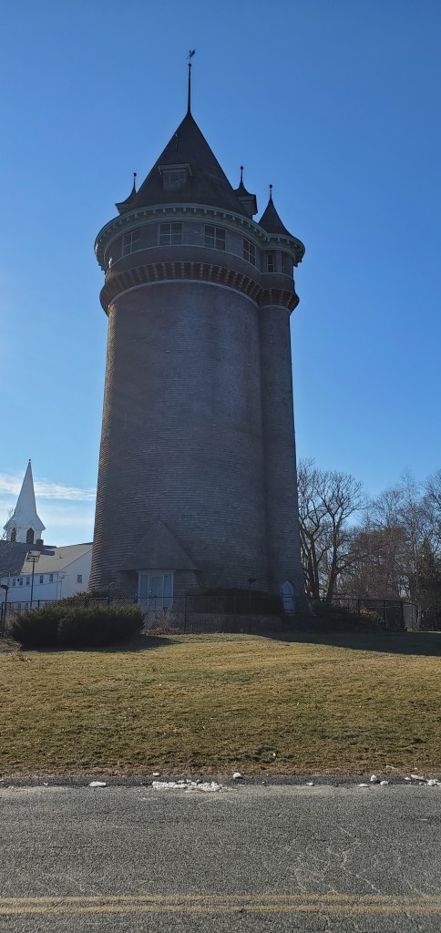 Our next stop–#12 on the map–was Lawson Tower in Scituate. Lawson Tower was once a water tower, built in 1902 and later enclosed by a wooden structure, on the style of a European castle turret, by land owner Thomas Lawson who was upset by the view the tower offerred. Jeanne and I share a love of backstory, so once we located the Tower, and parked, we read about the history and current use. There are 10 bells at the top of the Tower ranging from 300 to 3000 pounds. The Scituate Water Company stopped using the tank in 1988. Further googling revealed that it is sometimes opened to the Public for small events including sunset viewing.