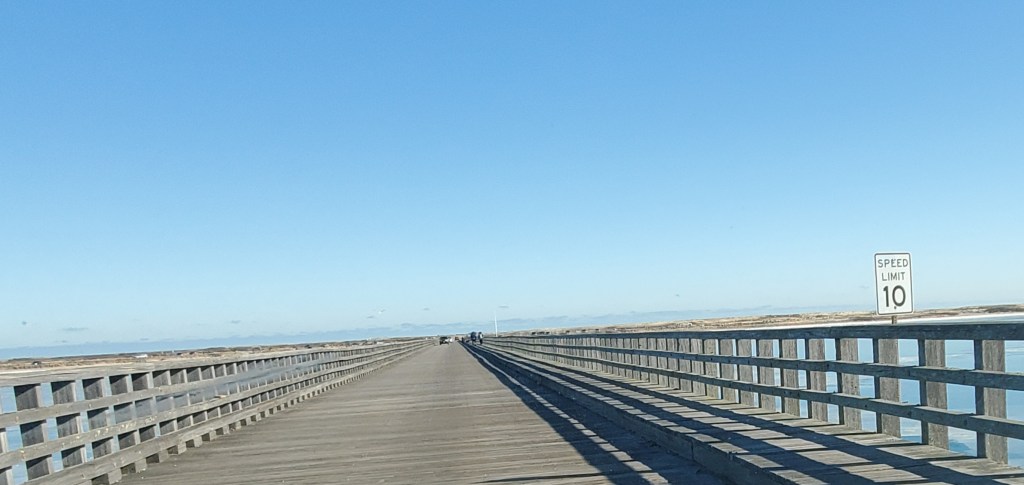 As we left Kingston, we wanted to take a scenic route that would bring us as close to the water as possible. This turned out to be Bay Road, to Washington Street, which brought us into Duxbury. We stopped once or twice to enjoy the views, marvel at some of the beautiful homes on the water, and take some pictures. When we arrived in Duxbury I set the GPS to Powder Point Bridge, which looked to be a relatively long bridge crossing the ocean. The bridge was very cool, looking more like a boardwalk for walking. I wasn’t sure what was on the other side but when we arrived there, it turned out to be Duxbury Beach, a narrow strip of land with beaches on either side. The majority of the parking was for Duxbury residents only, but there was a smaller parking lot for others. The beach area and parking lot were pretty well populated considering the time of year. We got out and walked briefly, enjoying the ice and snow on the beach and taking some more pictures before heading back to the car and back over the Powder Point Bridge.
